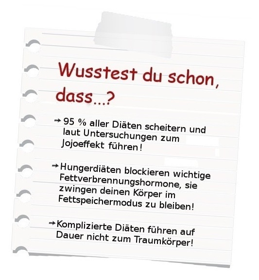 Du brauchst dafür keine Hungerdiäten oder nutzlose Diätpillen! (Auf diese billigen versprechen wirst du doch wohl nicht herein fallen oder?)